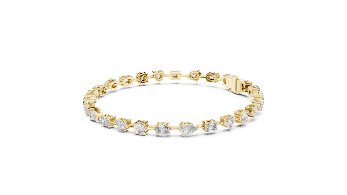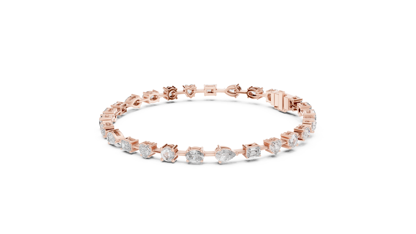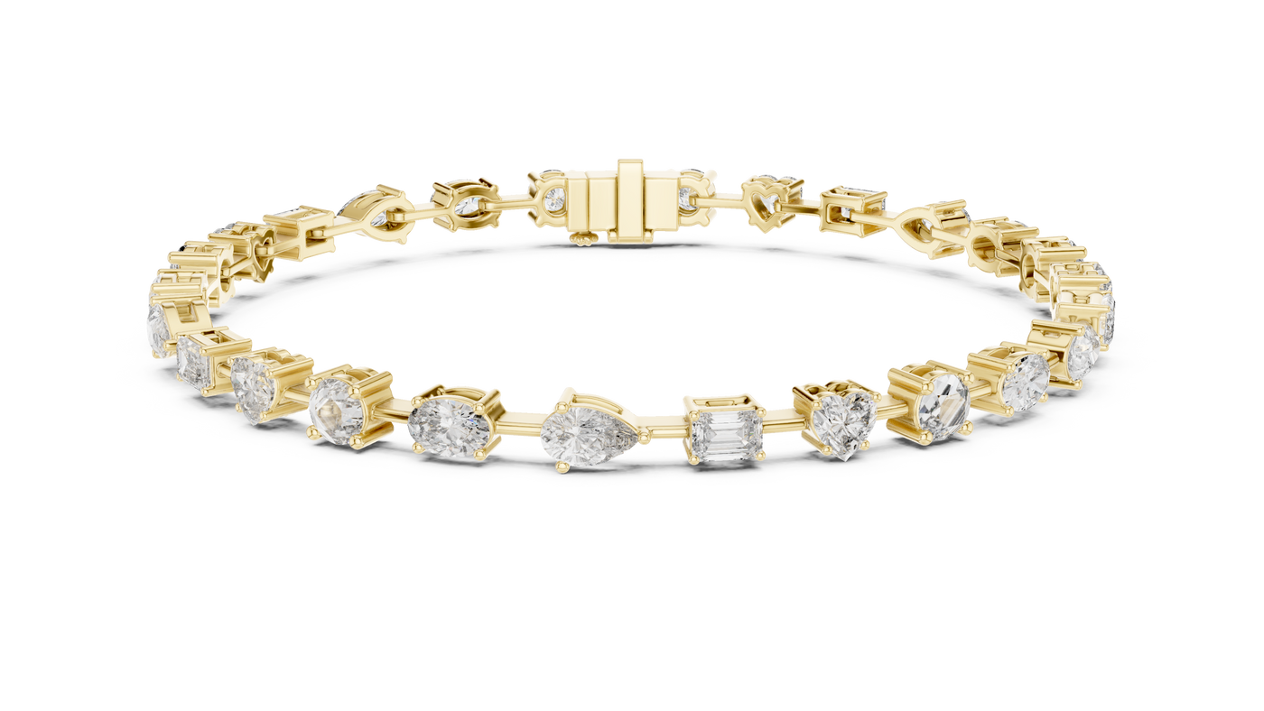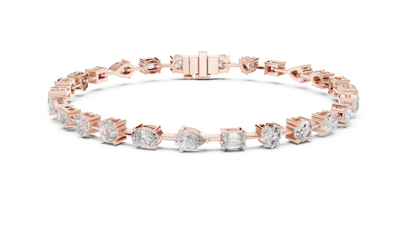 Inspired by timeless elegance and modern femininity, this multi-shape diamond bracelet is designed to celebrate individuality through a refined harmony of round, heart, emerald, oval, and pear-cut diamonds. The graceful 7-inch silhouette flows effortlessly on the wrist, offering a perfect balance of romance and luxury for everyday sophistication.