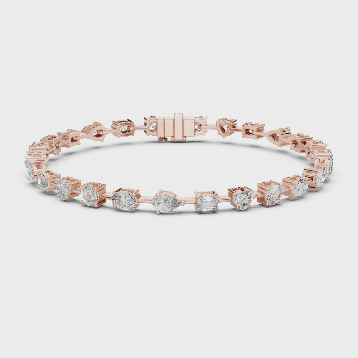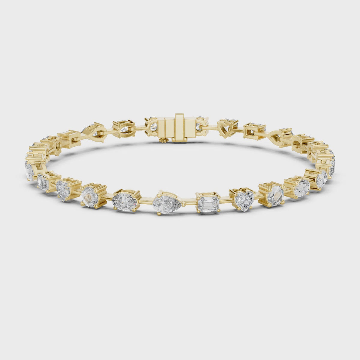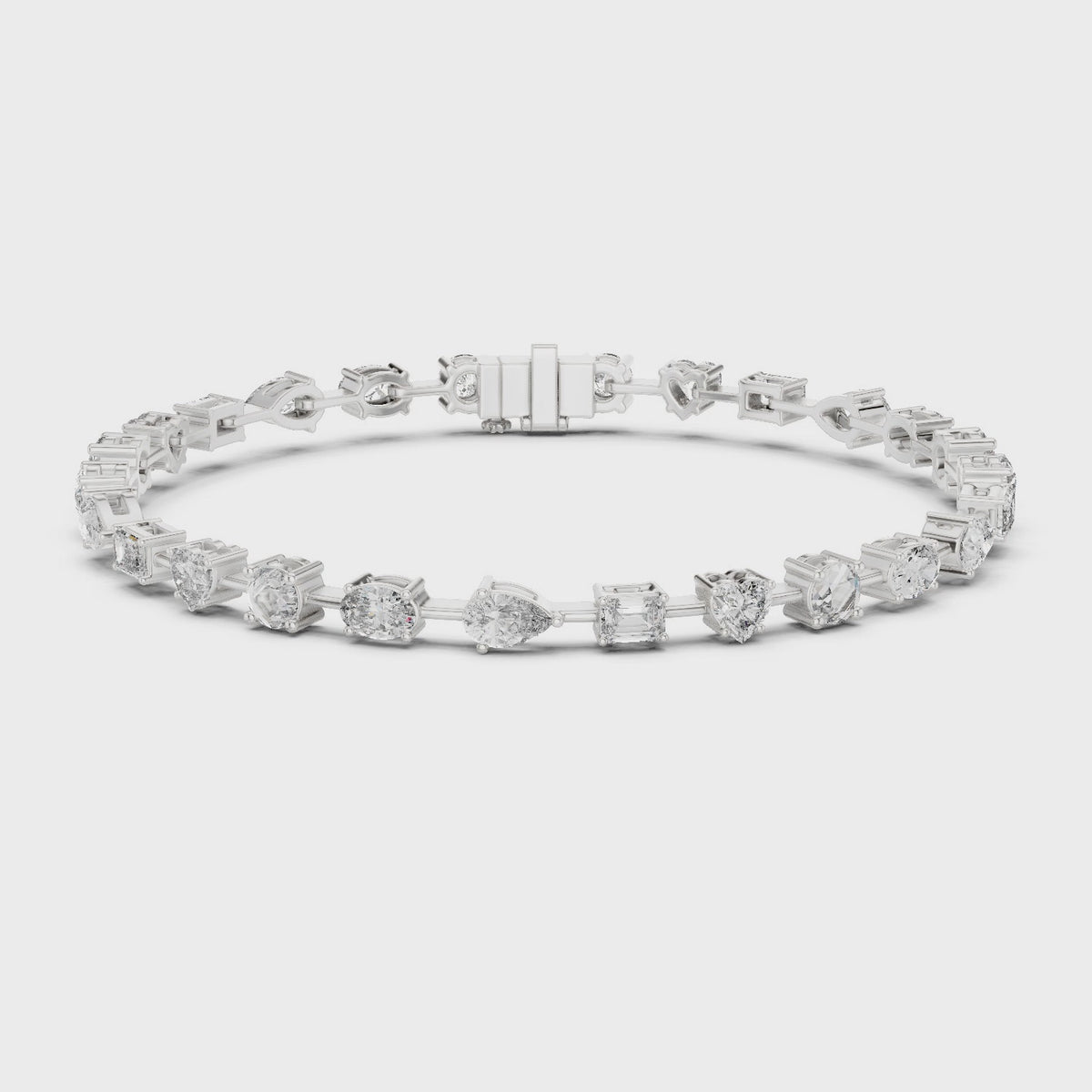 Inspired by timeless elegance and modern femininity, this multi-shape diamond bracelet is designed to celebrate individuality through a refined harmony of round, heart, emerald, oval, and pear-cut diamonds. The graceful 7-inch silhouette flows effortlessly on the wrist, offering a perfect balance of romance and luxury for everyday sophistication.