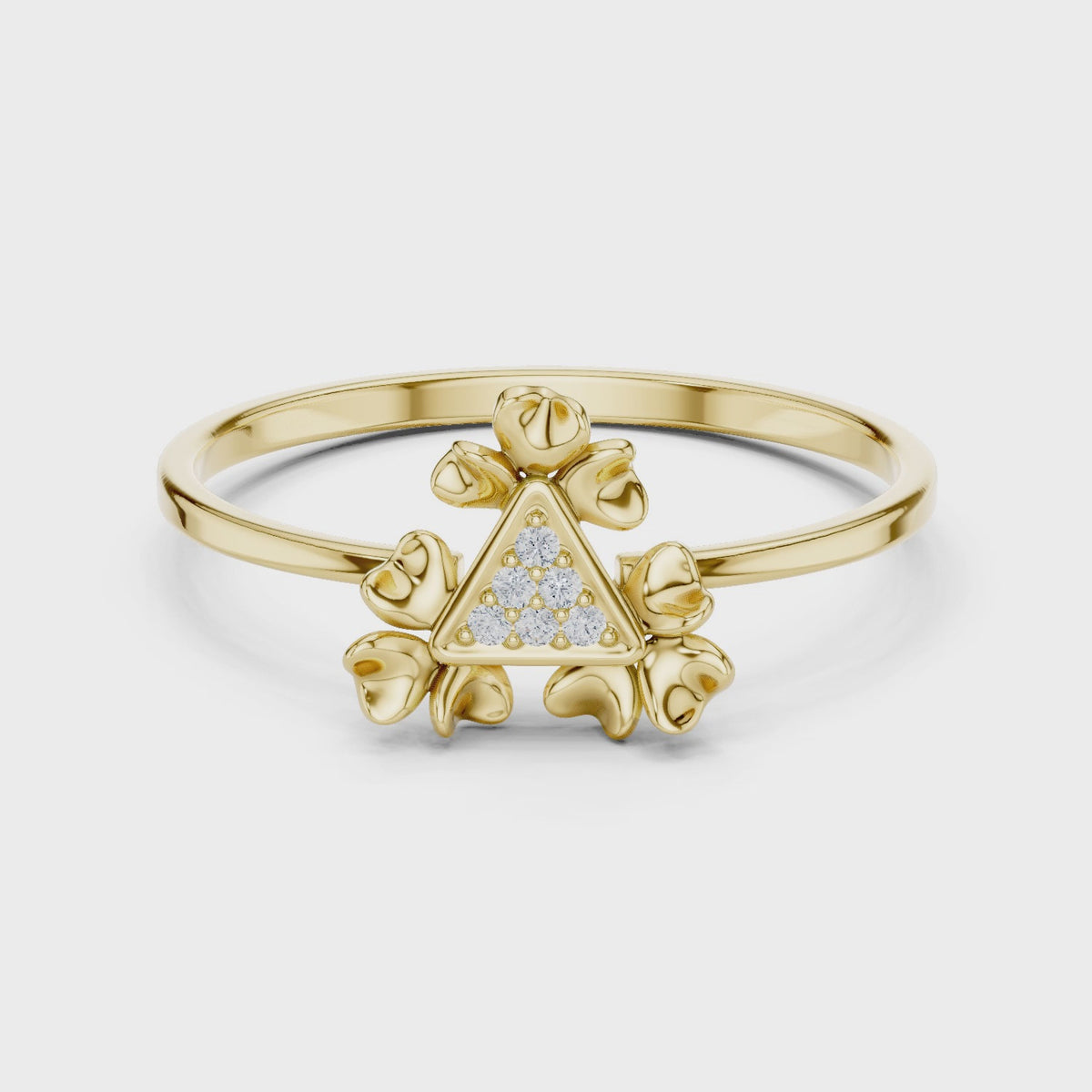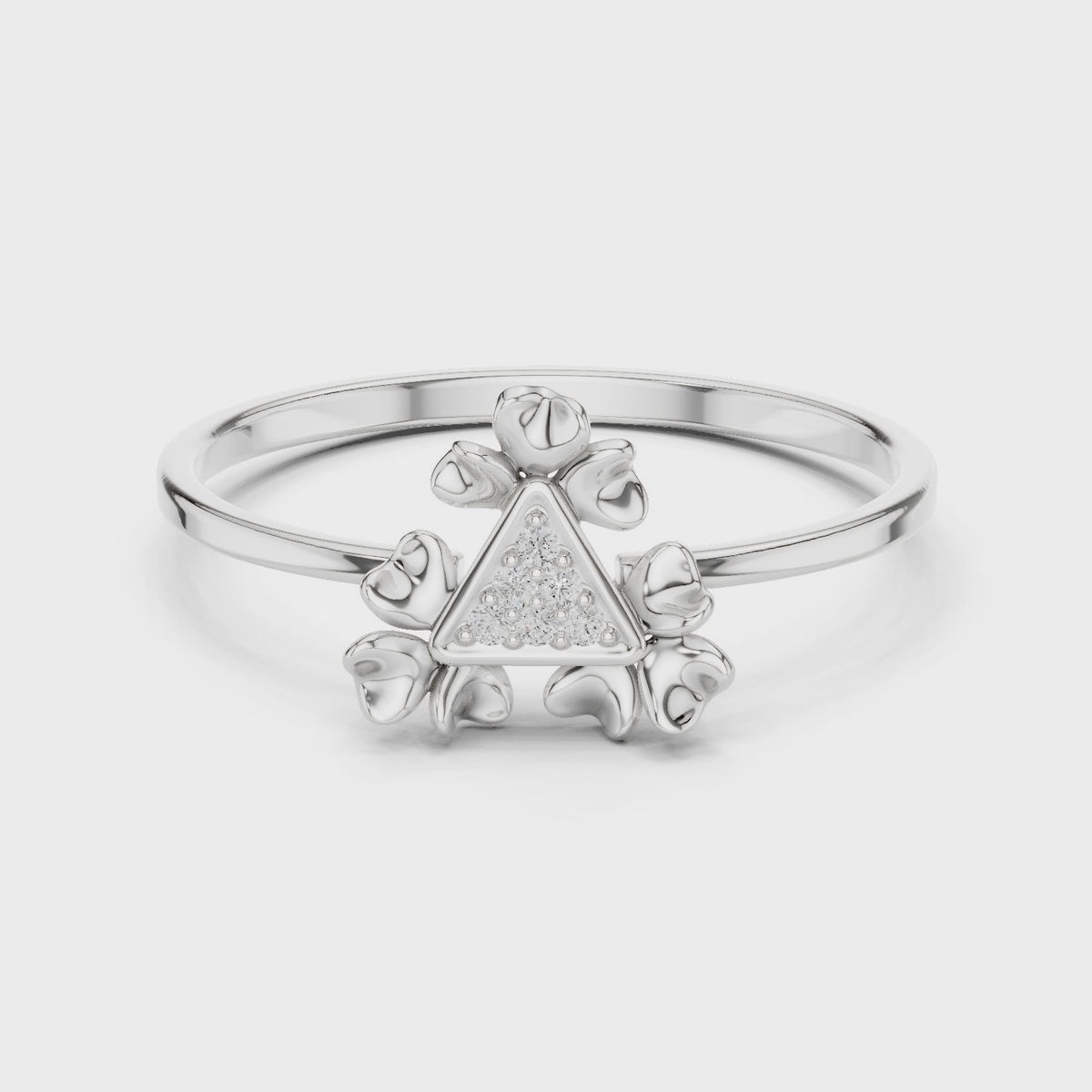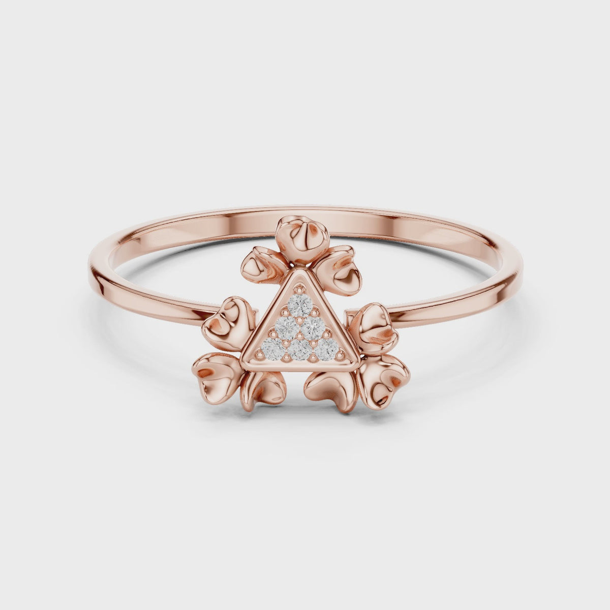 Inspired by geometric elegance and floral symmetry, this triangle bloom diamond ring showcases a striking fusion of modern design and soft romantic detail. The sculpted centerpiece with delicate petal accents creates a bold yet refined visual that radiates confidence, femininity, and timeless luxury.