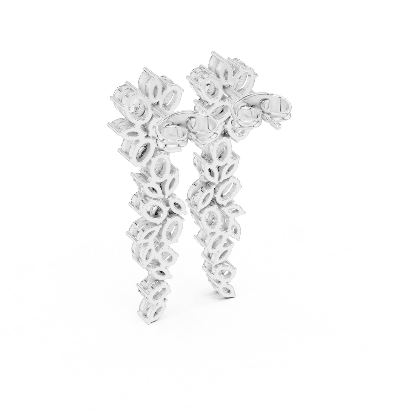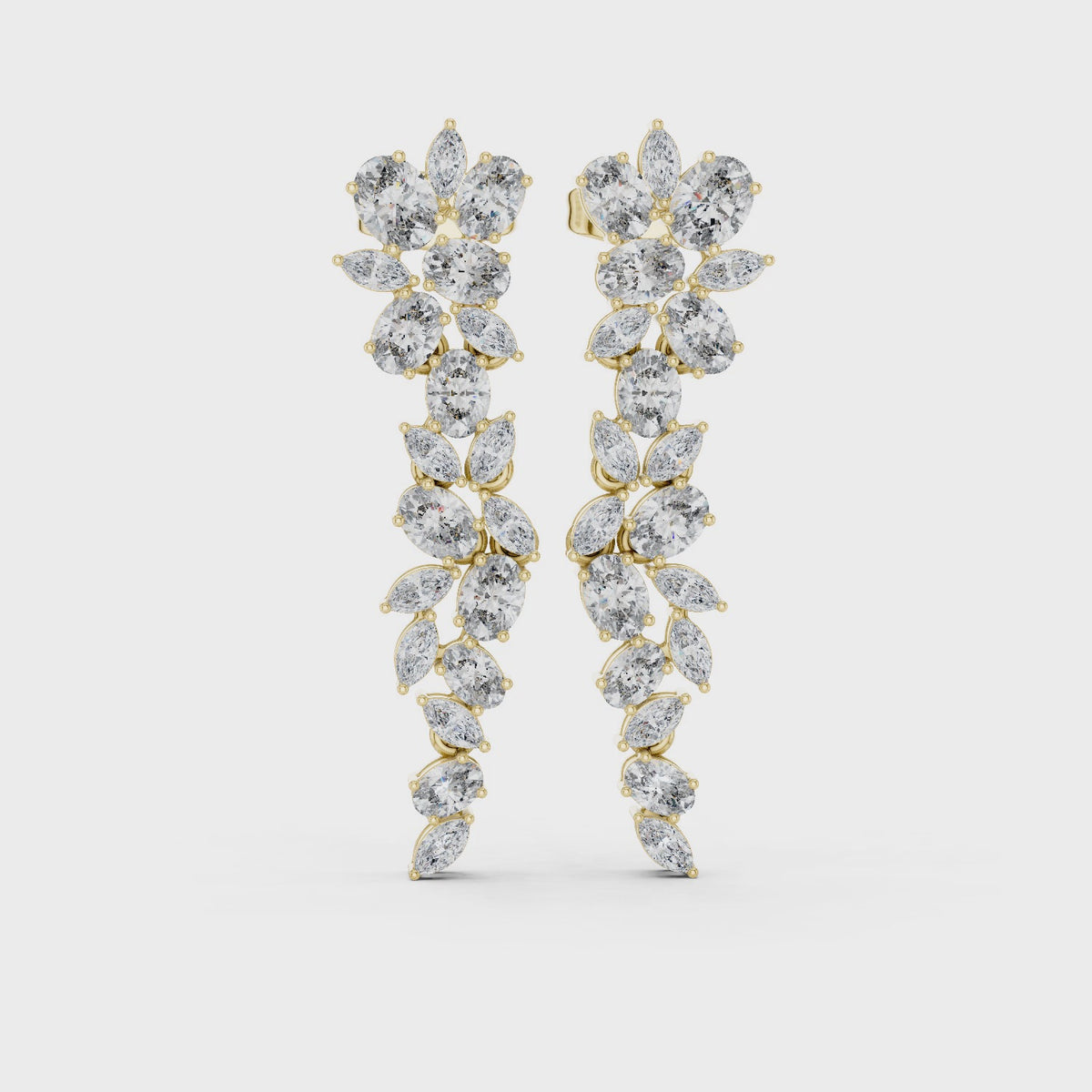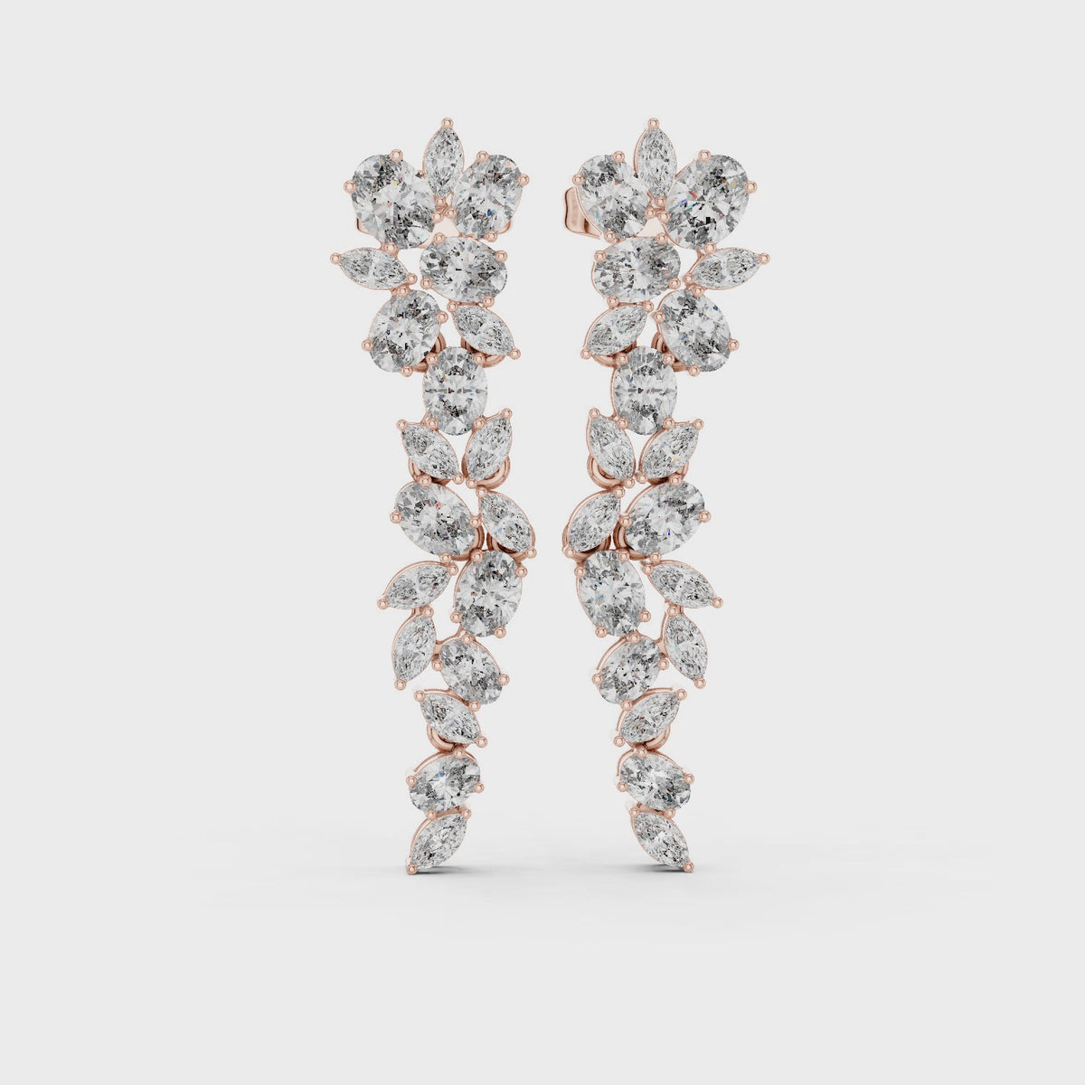 Inspired by timeless luxury, these exquisitely sculpted drop earrings showcase a graceful arrangement of marquise and oval diamonds, designed to create a soft cascading silhouette. Each stone is meticulously set using fine collet settings, ensuring brilliance from every angle.