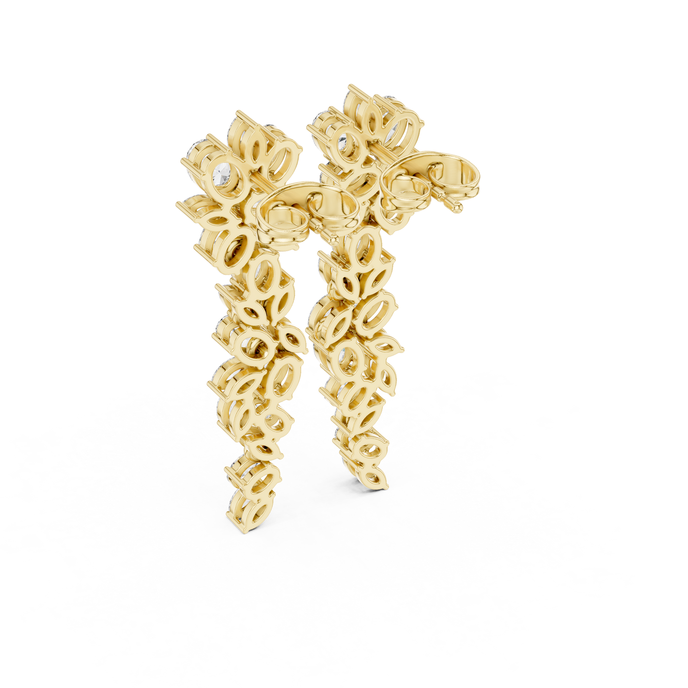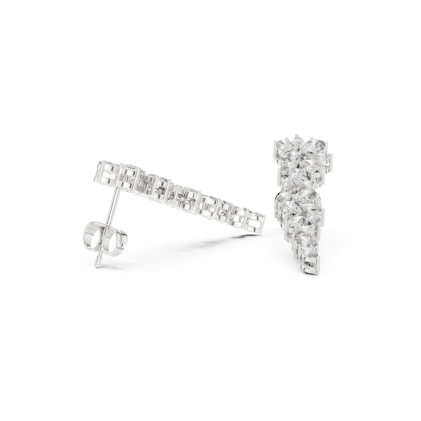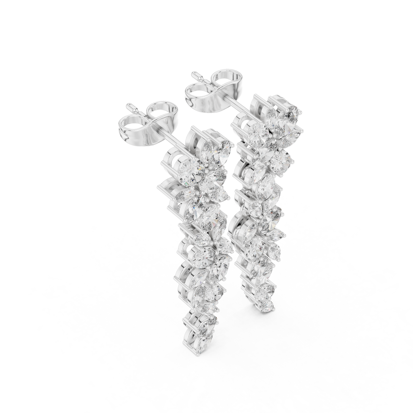 Inspired by timeless luxury, these exquisitely sculpted drop earrings showcase a graceful arrangement of marquise and oval diamonds, designed to create a soft cascading silhouette. Each stone is meticulously set using fine collet settings, ensuring brilliance from every angle.